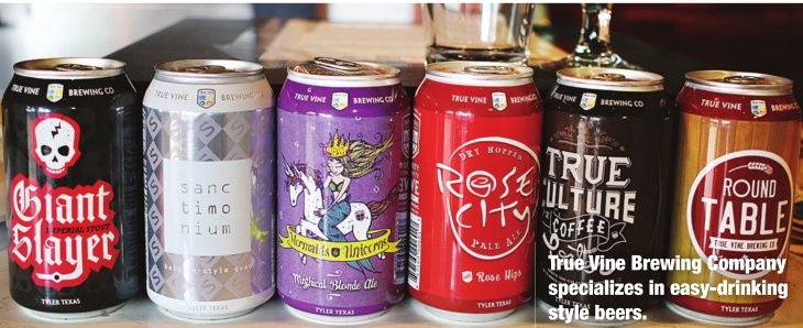 True Vine Brewing Company (219 South Englewood Ave., Tyler) has a laid-back, backyard vibe unlike any other brewery in the region. The brewery’s tiny, 500-square-foot tap room opens up onto a sprawling courtyard hangout complete with a live music stage, hand-made benches and charmingly mismatched table-andchair sets. Founder and owner Ryan Dixon opened the brewery in 2014. The scrappy, DIY feel of the brewery is a reflection of Dixon’s warm, welcoming personality.