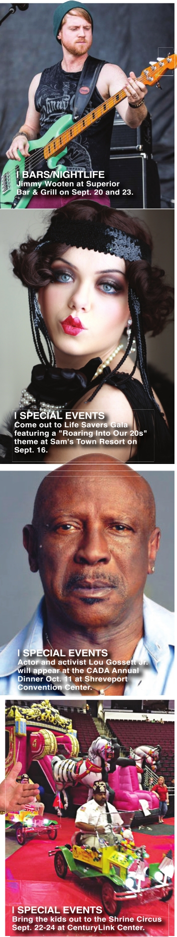 LEE’S: Acts are 8 p.m. to midnight weekdays, 9 p.m. Fridays and 9:30 p.m. Saturdays. Blues Jam every Monday night; Joe Parault Oldies, Sept. 14, 21, 28; Kandu, Sept. 15, 22, 29;. E. Kings Highway, Shreveport. 861-2151.