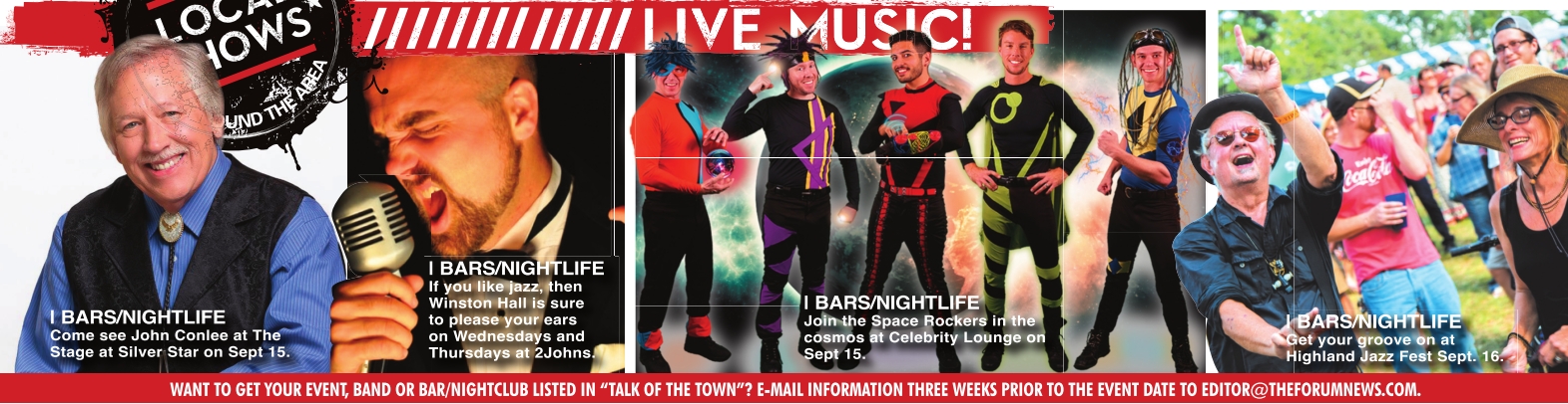 27; Hollow Decks, Sept. 28; The Hipshot, Sept. 29; Live 5, Sept. 30 .