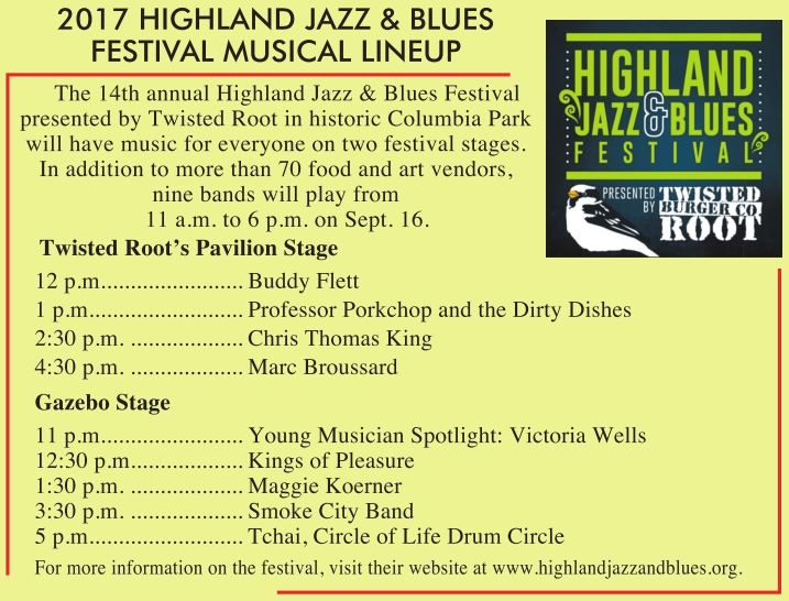 The 14 annual Highland Jazz & Blues Festival will be held on Saturday, Sept. 16, 11 a.m. to 6 p.m. in the historic Highland neighborhood’s Columbia Park in Shreveport. With two stages of music and 70 food and art vendors, this free festival is a gift to the community from the Highland Area Partnership.
