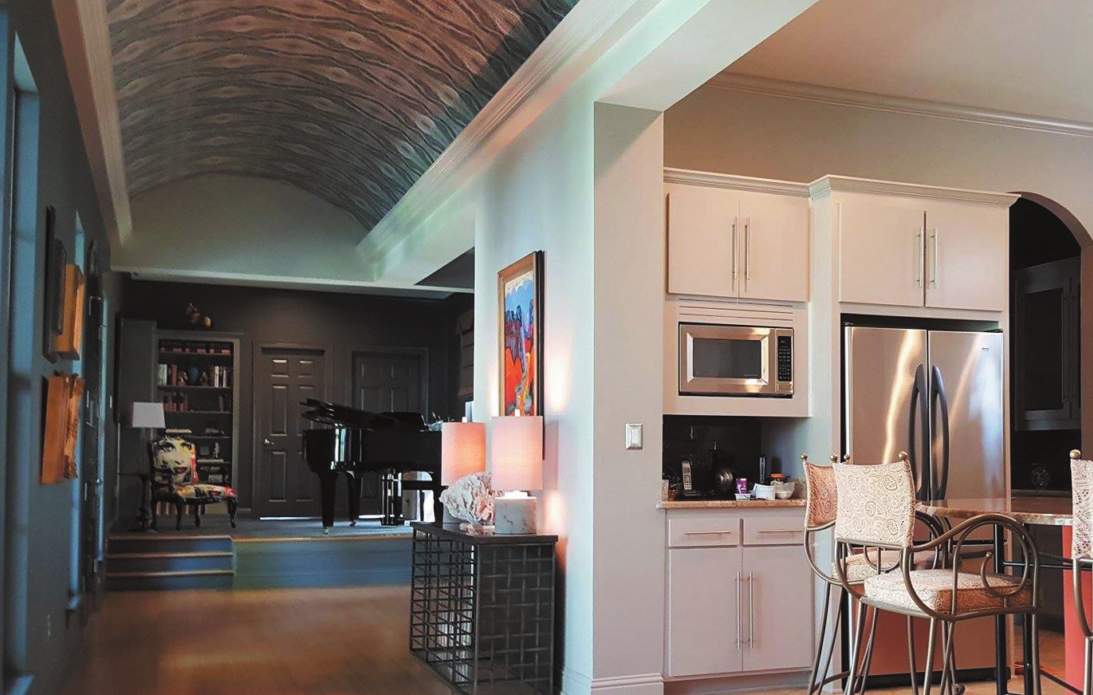Griffing said the original plan was to use an ombré of color from black in the music room to white in the living room. Instead, the final product is a mixture of different shades of gray tied together with geode pattern wallpaper from Caddo Paint on the entry hall’s barrel vault ceiling.