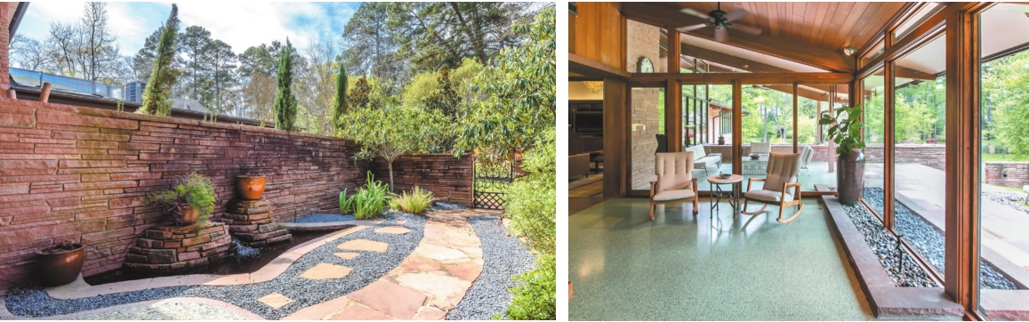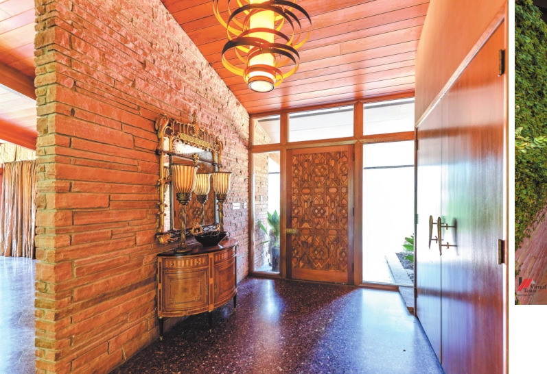 The terrazzo floors continue into the of the foyer. A floating granite counter, its fluid shape reminiscent of lapping waves, serves a dual purpose as art and a buffet. The vaulted ceiling is wood paneled and has wood beams. The room overlooks a tranquil, redesigned courtyard garden. The soothing outdoor space showcases a bubbling water feature and koi pond and has a flagstone path.