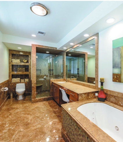 and heated marble floors. The “her” side also has a vanity area and