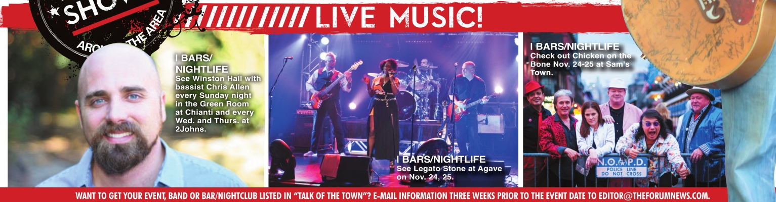WANT TO GET YOUR EVENT, BAND OR BAR/NIGHTCLUB LISTED IN “TALK OF THE TOWN”? E-MAIL INFORMATION THREE WEEKS PRIOR TO THE EVENT DATE TO EDITOR@ THEFORUMNEWS.COM .