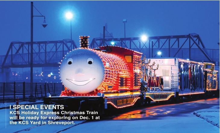 DEC. 1: KCS HOLIDAY EXPRESS CHRISTMAS TRAIN. Kansas City Southern has transformed retired trains into a holiday spectacle with reindeer, a mini-Christmas village, gingerbread box car, elf workshop and more. Free. 4 p.m. KCS Yard, 4500 North Lakeshore Drive, Shreveport. Visit www.holidaytrailoflights.com.