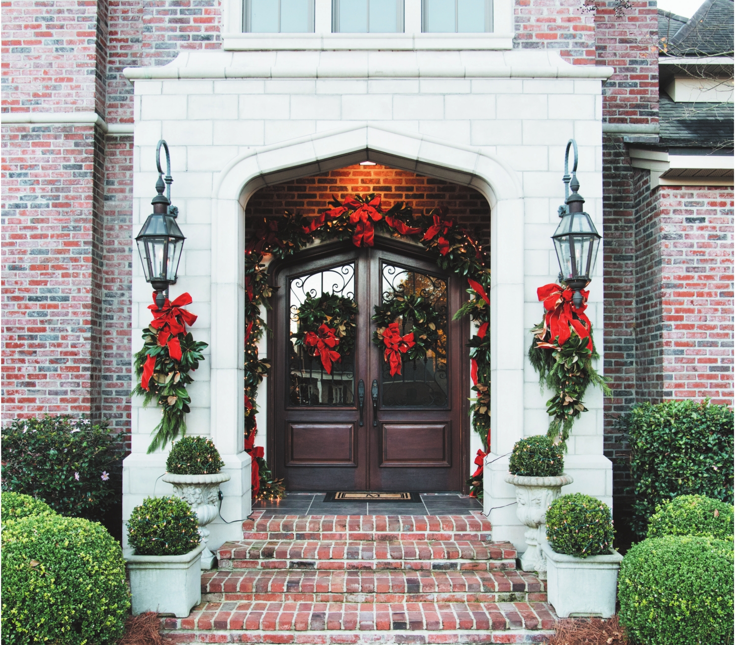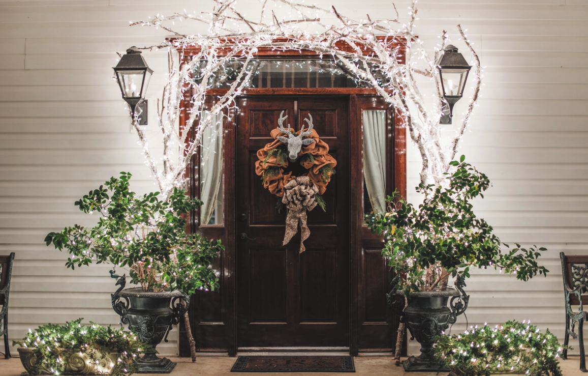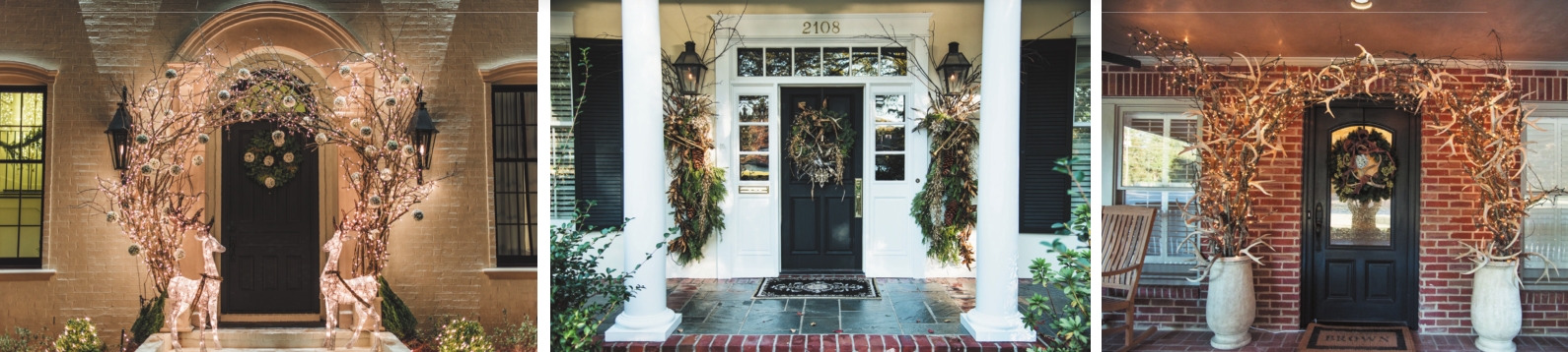 When The Forum editors caught a glimpse of Monroe designer Clinton Downing’s holiday designs, we just had to share with our readers. Downing has been featured on our pages before for his outstanding design work, and his repertoire includes much more than just holiday decor. He also works in interior design, store display and fashion design. His talent speaks for itself, and you are sure to find inspiration. Whether going for the traditional or grand, here are seven designs that will impress even Santa himself. The top image (see page 33) features a classic display with boughs of cedar and magnolia with lush red ribbons. At lower left, an arched doorway is framed in a shimmering display of branches, snow-covered mistletoe orbs and prancing reindeer. The center image has a natural look with glitz, trumpets and branches for dramatic effect. In the third image, Downing keeps it simple but fun. At left: You can’t get more classic than this simple display featuring old world charm with greenery, berry stays, and mossand bark-covered orbs. The Nutcracker display (at left) brings vibrant color to this fabulous entrance that all passersby will surely notice.  And on this page, flocked branches sparkling with twinkle lights frame the doorway, and lights shine from the planters and evergreens, making the natural, deerhead door wreath an elegant focal point.