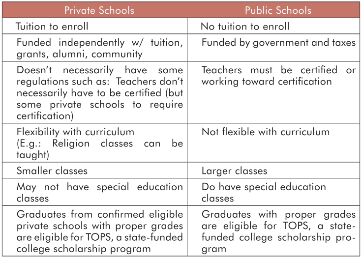 Parents may question how to prepare their college-bound child for attending college. They may think about whether to place their child in a private or public school in their elementary through high school years. There are pros and cons to each, but parents need to weigh the options and make the decision that will best benefit their individual child. Some, not all, of the differences may be found below and may be different for each individual school: See table below.Of course, the fact that parents teach their children from elementary through high school to do their best, listen to the teacher in the classroom, do their homework, study well for tests and be on their best behavior, will carry over into their college school years.