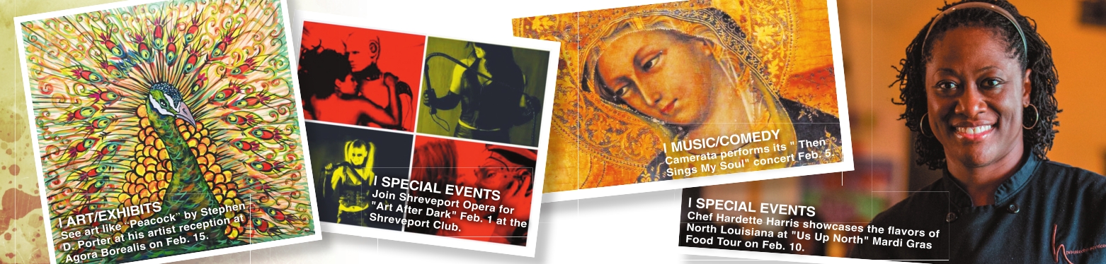 FEB. 15: STEPHEN D. PORTER ARTIST RECEPTION. Porter’s exhibition at the Vintage Gallery is a collection of paintings created over his career culminating in his second largest paintings to date. 5-8 p.m. Vintage Gallery at Agora Borealis, 413 Lake St., Shreveport. Visit www.theagoraborealis.com.