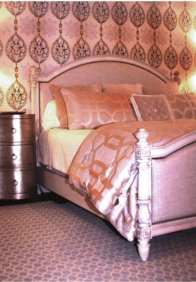 The homeowners shared their vision, and the result is beautifully rich and simply beautiful. The wallpaper has a beautiful blue in the pattern, the darkest of which the ceiling trim is painted in a semi-gloss oil-based paint. The ceiling is a flat matte wallpaper in navy. The bedding is reflective of the gold and champagne threads from the wallpaper.