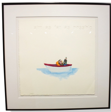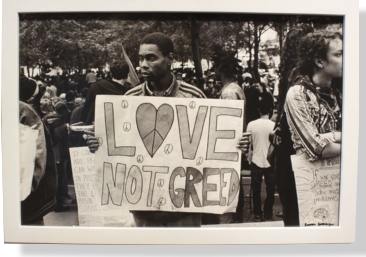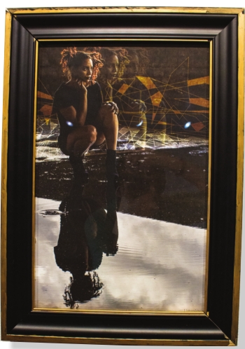 Discovering works that were better than others was like a treasure hunt. The Best in Show piece, Joshua Chambers’ gouacheon-paper, “Aim as Far as Possible,” a depiction of a monkey drilling into his own boat, was hidden in the back. Chambers’ small painting stood out because of his skillful yet delicate drawing, and the use of dark humor. Honorable mentions like Jazmin Jerrigan’s “Into the Looking Glass,” a multi-layered depiction of a girl contemplating existence, and Ransom Ashley’s “Love Not Greed,” an archival photograph from a social justice rally, were also barely visible. It was a shame to have smaller works like these given lame real estate, while several bland abstract paintings took up a lot of prime space on the first-floor gallery.