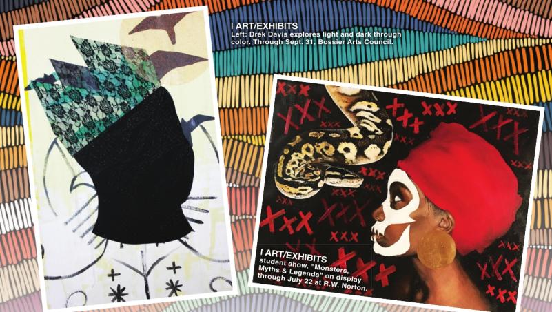 AUG. 1-SEPT. 31: THE LIBERTY COLLECTION. Artist Drék Davis uses color that highlights both the real and imagined world that we live in with the duality and dichotomy that is Americanness. A free opening reception is from 6-8 p.m., Aug. 10, at Bossier Arts Council, 630 Barksdale Blvd., Bossier City. Visit www.bossierarts.org.