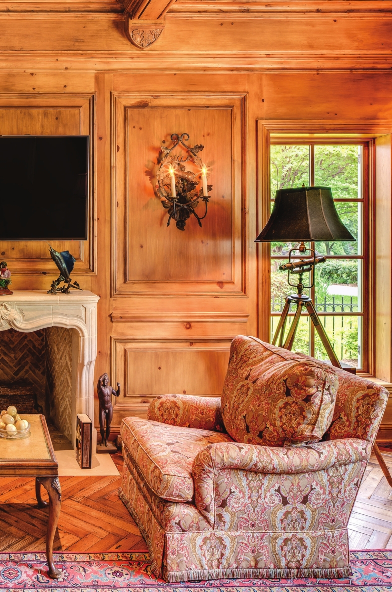 In the richly paneled den, wildlife art and sculptures are prominent among classic elements such as the marble fireplace, matching torchieres and twin sofas.