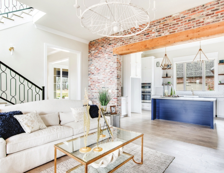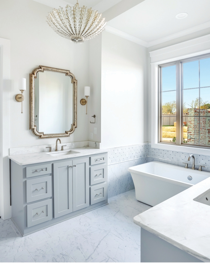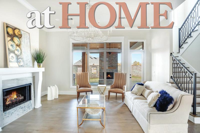 Inside the home, trendy gold touches, like hardware and mirror frames, can be spotted throughout. Tanner Construction’s signature “Circle with an X” ceiling treatment can be found in the dining room, as well as a bank of windows overlooking the tranquil neighborhood. Builder Tammy Herring utilizes architects from south Louisiana, so her homes have a unique, fresh approach for the Shreveport- Bossier locale.
