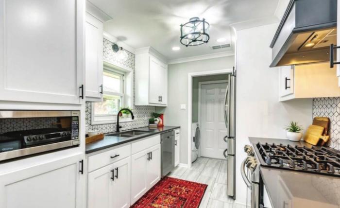 In order to stick to the project’s budget, Willard says they worked within the room’s original footprint. The entire space was gutted, including the removal of wallpaper and the soffits above the kitchen cabinets. The modern new cabinets go all the way to the ceiling to increase storage space. The cabinet over the refrigerator is deeper now to maximize the available storage there as well. All the doors and drawers are now soft close.