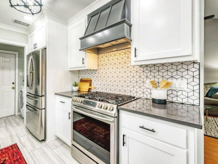 The countertops are Silestone quartz in Marengo and the 12x24 porcelain floor tiles are Happy Floors in Apollo Gray. Both came from United Tile. The backsplash is Daltile