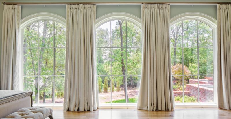 Natural light streams through a trio of arched windows melding elegance, functionality and design in this master bedroom.