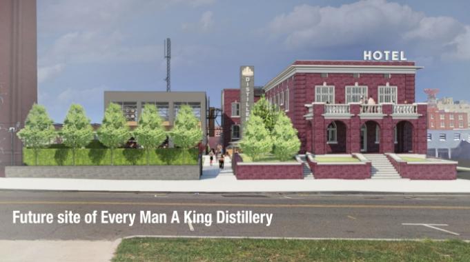 Built in 1915 as a railroad hotel, the building and adjacent property will soon become a unique entertainment center with Every Man A King Distillery, the Revenir restaurant, a speakeasy, outdoor patio/courtyard and event space.