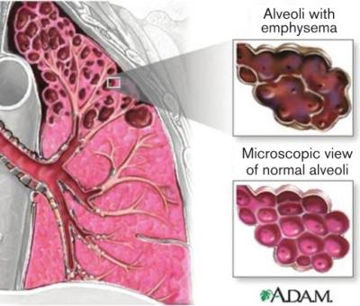 Emphysema and chronic bronchitis are the two most common conditions of COPD. Chronic bronchitis is inflammation and irritation of the lining of the bronchial tubes, which carry air to and from the air sacs (alveoli) of the lungs. The inflammation results in a persistent cough and an increase in mucus (sputum) production. Emphysema is a condition in which the tiny air sacs at the end of the smallest air passages are damaged beyond repair because of long-term exposure to cigarette smoke and other environmental irritants.