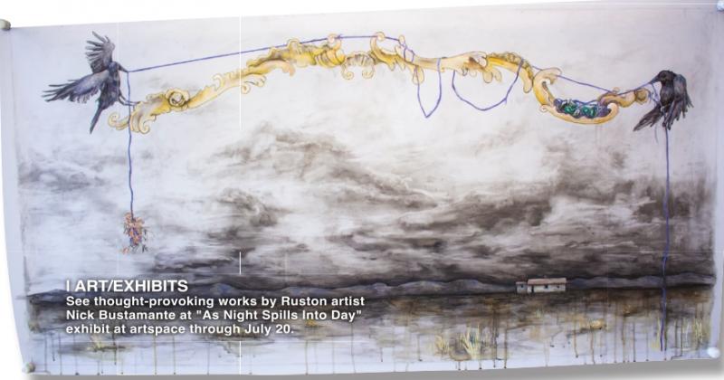 THROUGH JULY 20: "AS NIGHT SPILLS INTO DAY." Ruston artist Nick Bustamante will explore the relationship between interior and exterior spaces with this exhibit. Artspace, 708 Texas St., Shreveport. Visit www.artspaceshreveport.com.