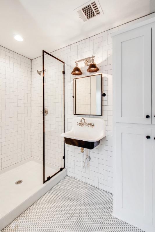 penny-round flooring, and a 1940s sink that was salvaged and restored. A