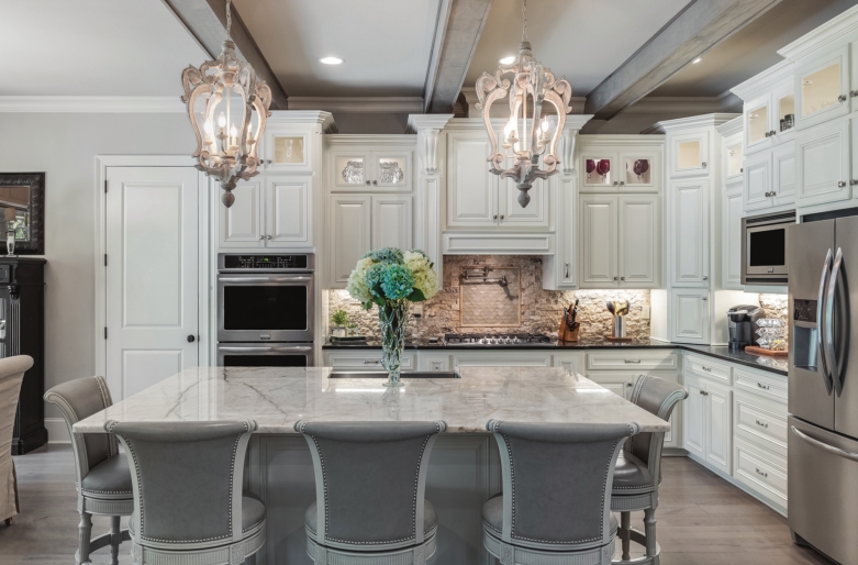 The quartzite countertops in the kitchen are a mixture of golds, silvers, creams and white. The material was chosen for its translucent quality. Lighting was installed underneath the kitchen island and utilized as a nightlight. A stone backsplash adds to the rustic, mountain feel. White cabinetry and exposed wood beams complete the space.