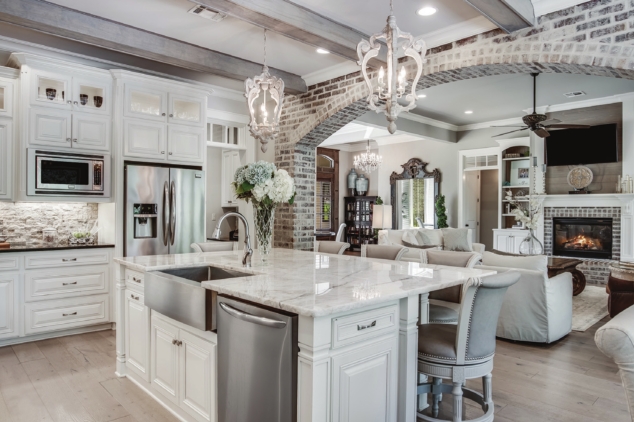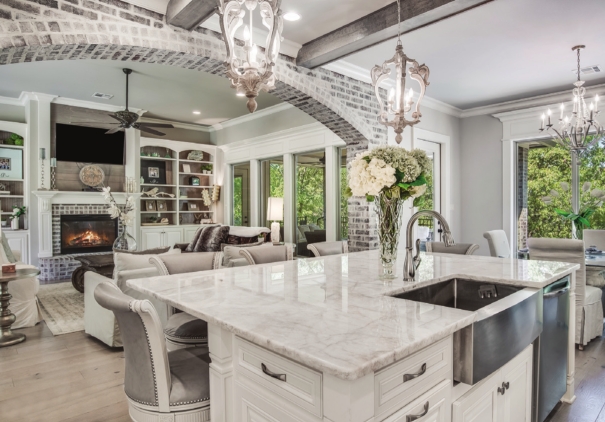 while Jacob prefers traditional cozy. “My husband likes leather, and I like everything white. So, we try our best to balance that,” she said. The living room furniture is an eye-pleasing mix of white and dark leather couches and chairs. Much of the furniture was purchased while the family lived in Montana, but a few pieces were procured locally at Chateau en Mae. April says the majority of the home’s lighting came from Restoration Hardware. The brick fireplace is a favorite, as the family enjoys sitting on the hearth to warm up in the winter or just enjoy a good book.