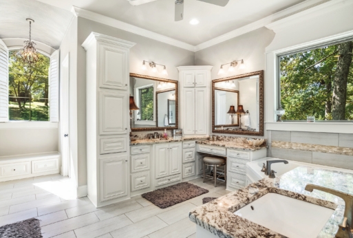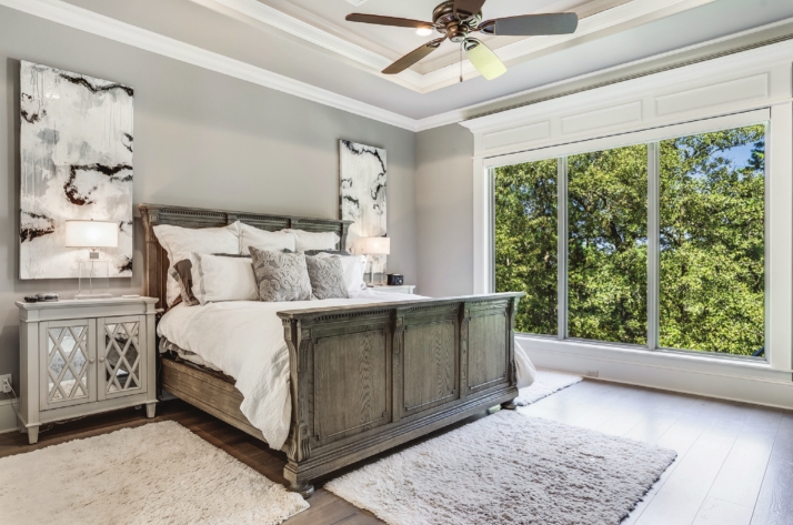 The master bedroom is also located on the upper level. Large windows offer a serene view of the wooded property. Quality Shades & Shutters installed retractable blackout shades, and furnishings came from Restoration Hardware. In the master bath, the cabinetry in is white with acrylic hardware from River Cities Lighting and features granite countertops.