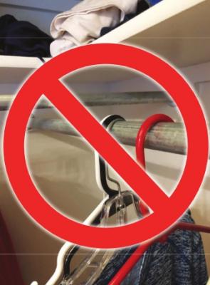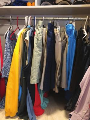 Next, all hangers should match. I prefer the clear acrylic hangers used in department stores. These keep the shoulders rounded on blouses and jackets. They come in dress and clip hangers, utilized for skirts and hanging pants long.