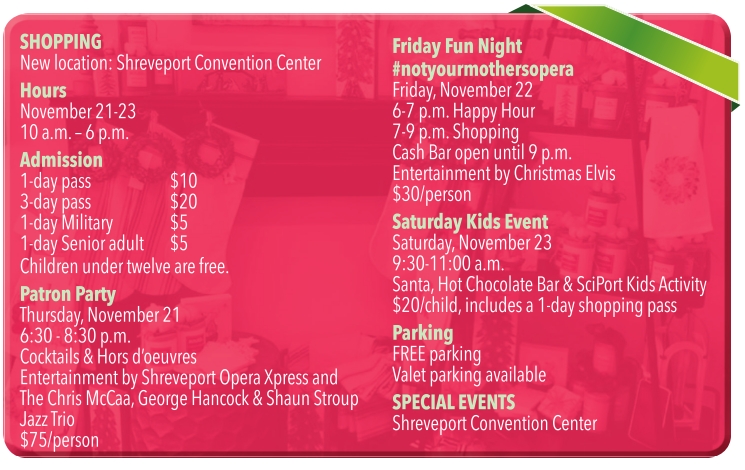 Tickets for three special events are available. A Thursday evening Patron Party will offer cocktails and hors d’oeuvres with entertainment by the Shreveport Opera Xpress (SOX) artists and a jazz trio. Friday Fun Night will feature Christmas Elvis and a signature cocktail at a happy hour-themed #notyourmothersopera. Kids will be treated on Saturday morning to Santa, a SciPort activity and a hot chocolate bar. “Our wide range of merchants and mix of special events will make for a fun-filled time with friends,” added Hardtner, “and can be a great excuse for an overnight trip for out-of-town shoppers, too.”