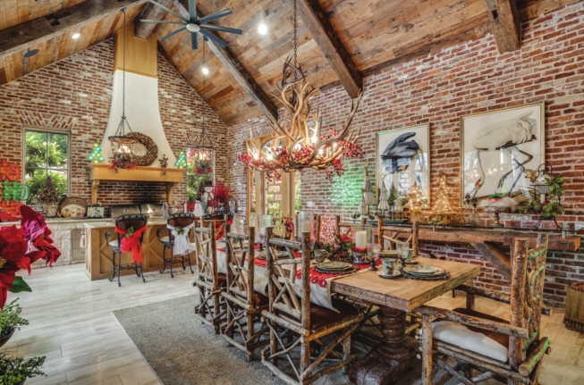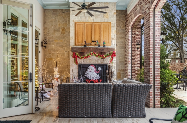 Fitz and Floyd collectibles, including pieces from the Scrooge series, are displayed on a hutch handcrafted by her husband when the couple were newlyweds. “They are special. They’re some of the first pieces I got when I got married,” said Burroughs. Holiday joy is also added to the outdoor kitchen, back porch and pool area.