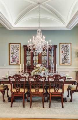 Inside, Santa and Mrs. Claus figures stand in the foyer near a glittery, whimsical tree, and a garland encircles the staircase banister. Burroughs describes her den as fun and happy. Her couches are “dressed” in red tutus crafted by MilandDil Designs, and the antlers of the trophy deer on the wall are adorned with ornaments. Built-ins house some of Burroughs’ favorite Department 56 collectibles. “It’s very, very old. When we first got married 28 years ago, I started collecting it. They don’t make it anymore,” said Burroughs. “I have all the characters and put them all through the house; that’s what [the collection] is called – ‘All Through the House.’ The Mark Roberts fairies and hand-painted Vietri decorations are also cherished pieces. Crimson-clad reindeer showgirls perch on the hearth below a green-and-red bunting and watchful Nutcrackers.