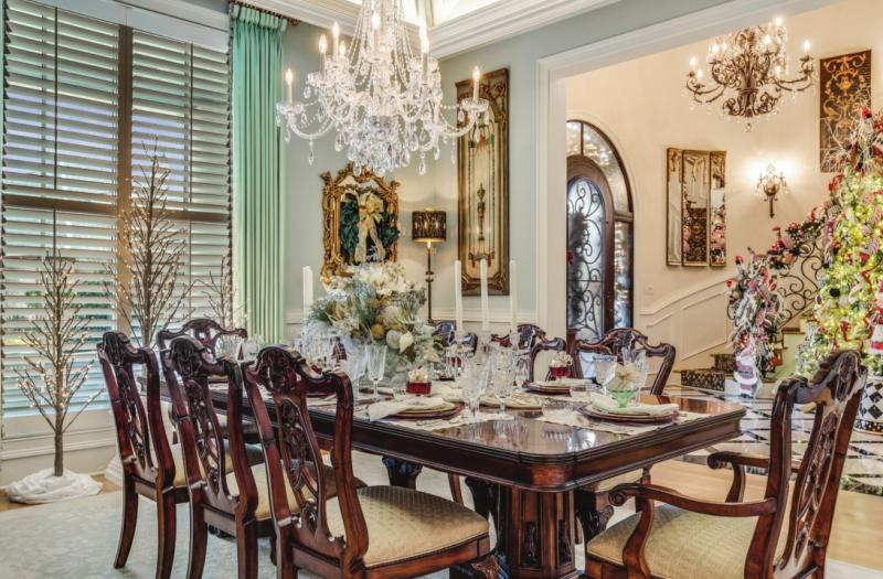 The formal dining room remains elegantly simple and is a beautiful complement to the dramatic decorations thoughout the home. The vaulted ceiling and wall color are outstanding!