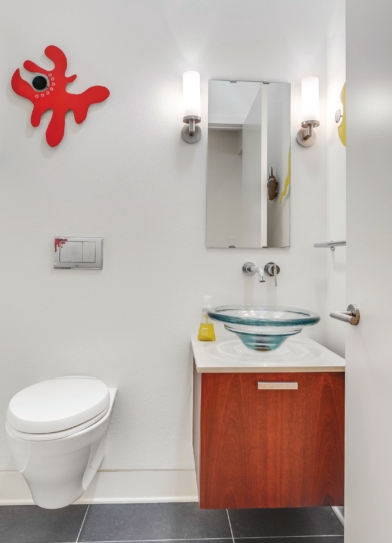 A floating vanity and an energy-efficient commode keep it light in the powder room.