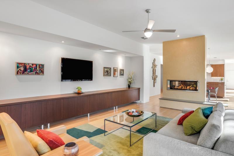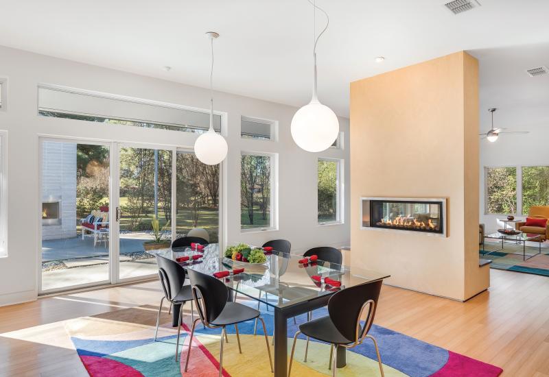 A two-sided fireplace serves the dining and living space.