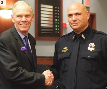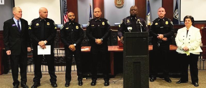 1) LSUS Chancellor Larry Clark, Cpl. Jason Frazier, Cpl. Marcus Mitchell, Deputy Chief Antwoine White, Cpl. Marcus Hines, Police Chief Ben Raymond, LSUS Foundation Executive Director Laura Perdue.