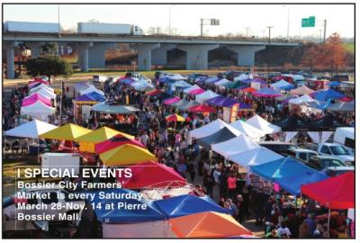 EVERY SATURDAY MARCH 28-NOV. 14: BOSSIER CITY FARMERS' MARKET. With fresh foods, honey, soap, makers, entrepreneurs, artists, food trucks and fun activities for kids. Free. 9 a.m. to 1 p.m. Pierre Bossier Mall, 2950 East Texas St., Bossier City. Visit www.BossierCityFarmersMarket.com.