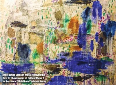 At Critical Mass 7, I chose Linda Moss’s “Matrilineal” for Best in Show. “Matrilineal” is a large, acrylic painting, a white field, populated by rectilinear patches of color – blue, gold, green, black and pink, a meandering sequence of arrows and Xs; there are also points where the artist covered the canvas with painted burlap, like a blood-soaked bandage on an incised wound.