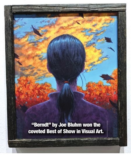 The artwork chosen for Best in Show has many qualities that allow it to emerge as the most engaging. The composition is so striking that it invites observation from afar. When approaching it, the details hold your attention and summon you to interact intimately. It isn’t certain whether the subject depicted in this portrait of the back of the head is a woman or man, creating an appealing ambiguity. The atmosphere of the sky, changing leaves and trees blowing in the wind that surrounds the subject allow us to get a good sense of the outlook they are experiencing. We can see, along with them, the miraculous object of their contemplation – a beautiful autumn sky at dusk. The scene itself is enchanting and we can imagine that the subject is just as entranced by the scene as viewers are with this painting.