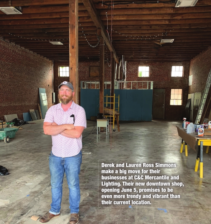 First will be their newly conceived C & C Mercantile and Lighting that they hope to open to the public on Monday, June 8. When you walk into the century-old building, you will be greeted and given coffee or tea. Try not to spill it as you take in the architecture and giant glass chandelier, then the art, furnishings and décor. Derek’s workshop will be on the main shop floor so that you can see his current lighting or furniture rehab project or talk to him about an idea you might have.