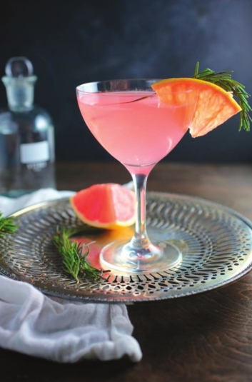 French Tart • 2 ounces Grey Goose Vodka (or your favorite) • 1 ounces St. Germain (elderflower liqueur) • 2 ounces freshly squeezed Ruby Red grapefruit • 1/4 ounces freshly squeezed lemon juice • 1/4 ounces rosemary simple syrup Place all in a cold cocktail shaker with cracked ice. Shake until well blended, and strain into a chilled coupe’ glass. Garnish with a sprig of rosemary and a slice of jalapeño (can omit the jalapeño if you want). Rosemary Simple Syrup Add 1 cup of sugar to 1 cup of water in a small boiling pan on the stove. Stir until all of the sugar has dissolved and bring to a boil. Turn off the heat and add 6-8 sprigs of fresh rosemary. Let cool completely, then strain liquid through a cheesecloth into a lidded jar. Will keep in refrigerator for a couple of months. Throw out when it begins to look cloudy.
