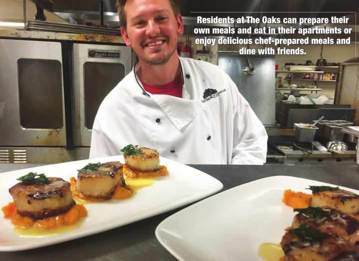 As with driving, cooking is optional as well. Dine with friends, make your meals at home or do both. You will love the chefprepared, restaurant-style meals that are nutritious, inspiringly creative and don’t skimp on taste. “We want residents to look forward to every meal,” says Philip Williamson, dining services manager.