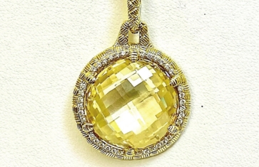 Santa Sid delivers this Canary Crystal and Diamond Pendant with a round 50ct. faceted canary crystal surrounded by paveset Diamonds set in 18K Yellow Gold on an 18” Yellow Gold Cable Link Chain.
