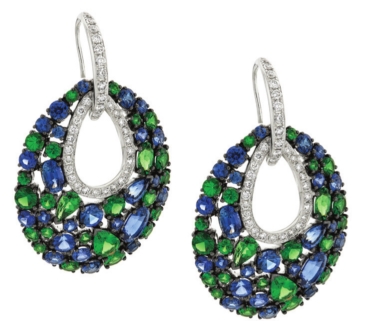 Bejeweled pair of 18K White Gold Earrings with pavé Diamond French Wires and an oval drop of various shaped Sapphires and Tsavorite.