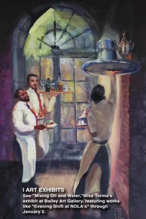 THROUGH JANUARY 2: BAILEY ART GALLERY, From established artists to the up-and-coming, the finest unique works this corner of the South has to offer. Now showing: “Mixing Oil and Water” with Represented Artist Mike Torma. Gallery hours: Tuesday, Thursday, Friday: 1 - 5:30 p.m., Saturday: 12 - 4:30 p.m. 214 Texas St., Shreveport. For more information or private showing, call 318-424-6764.