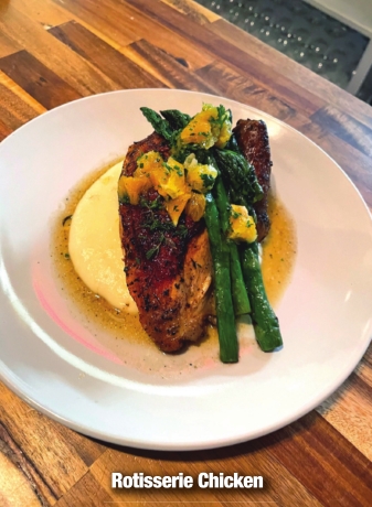 • Rotisserie Chicken – Slow rotisserie chicken served with buttered potato puree, sautéed asparagus with citrus gremolata. This is the top-selling menu item, and there’s no wonder why.