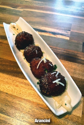 • Arancini – Panko-crusted spring pea risotto balls, chives and Parmesan, served with garlic aioli. This is a great item to split before your entrée.