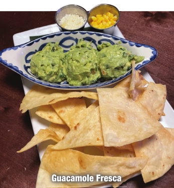 Guacamole Fresca – Avocado mash mixed with diced onion, tomato, jalapeno, cilantro, and lime, garnished with roasted corn and queso fresca. This appetizer also comes with special dipping chips.
