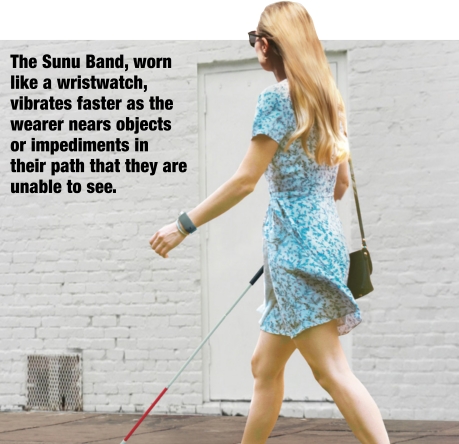 The “Sunu” – which Sanderson says makes her feel safer – is the Sunu Band, developed by Sunu Inc., based in Boston, Mass., and Guadalajara, Mexico. Sanderson wears the device on her wrist – like a watch. The closer Sanderson comes to an object – or the closer an object comes to Sanderson – the faster the Sunu Band vibrates.