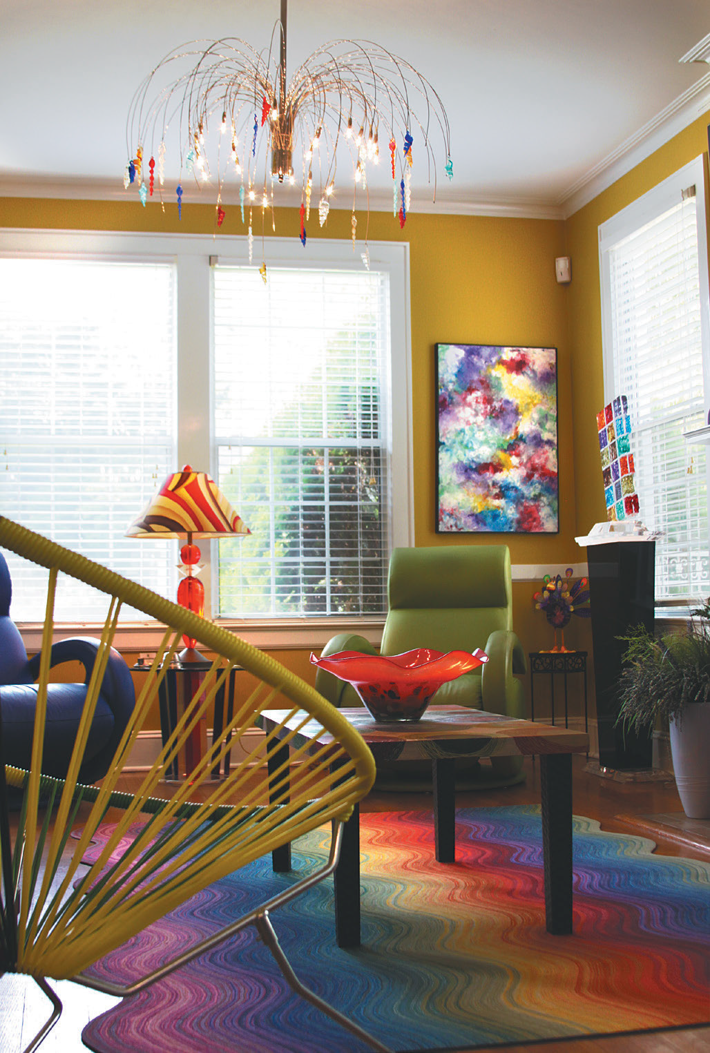 A rainbow light chandelier shines on a coffee table whose top can double as a work of art. Even the multi-hued lamp casts a splash of color.