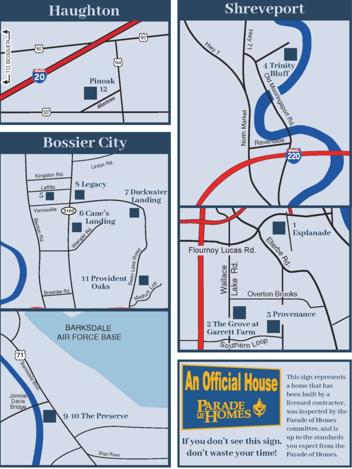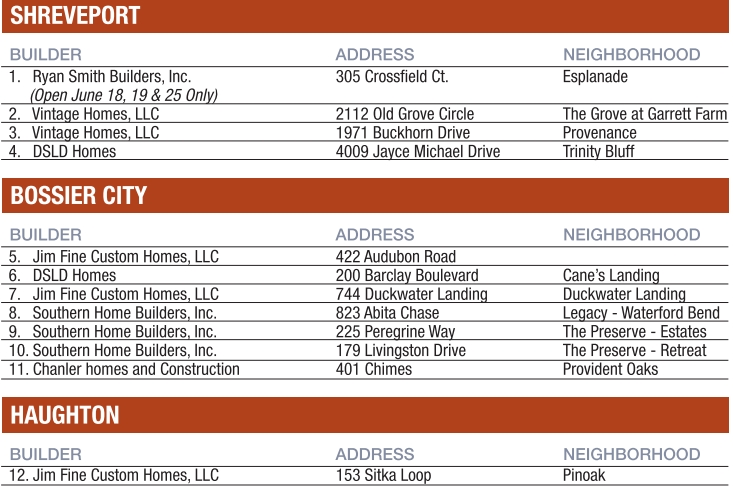 Tour attendees will have the opportunity to visit a total of 12 homes – four Shreveport homes, seven in Bossier City, and one in Haughton. The Shreveport homes are in The Grove at Garrett Farm, Esplanade, Provenance and Trinity Bluff neighborhoods. Bossier City subdivisions include Cane's Landing, Duckwater Landing, Legacy-Waterford Bend, The Preserve-Estates, The Preserve-Retreat and Provident Oaks. The Pinoak subdivision contains the Haughton home.